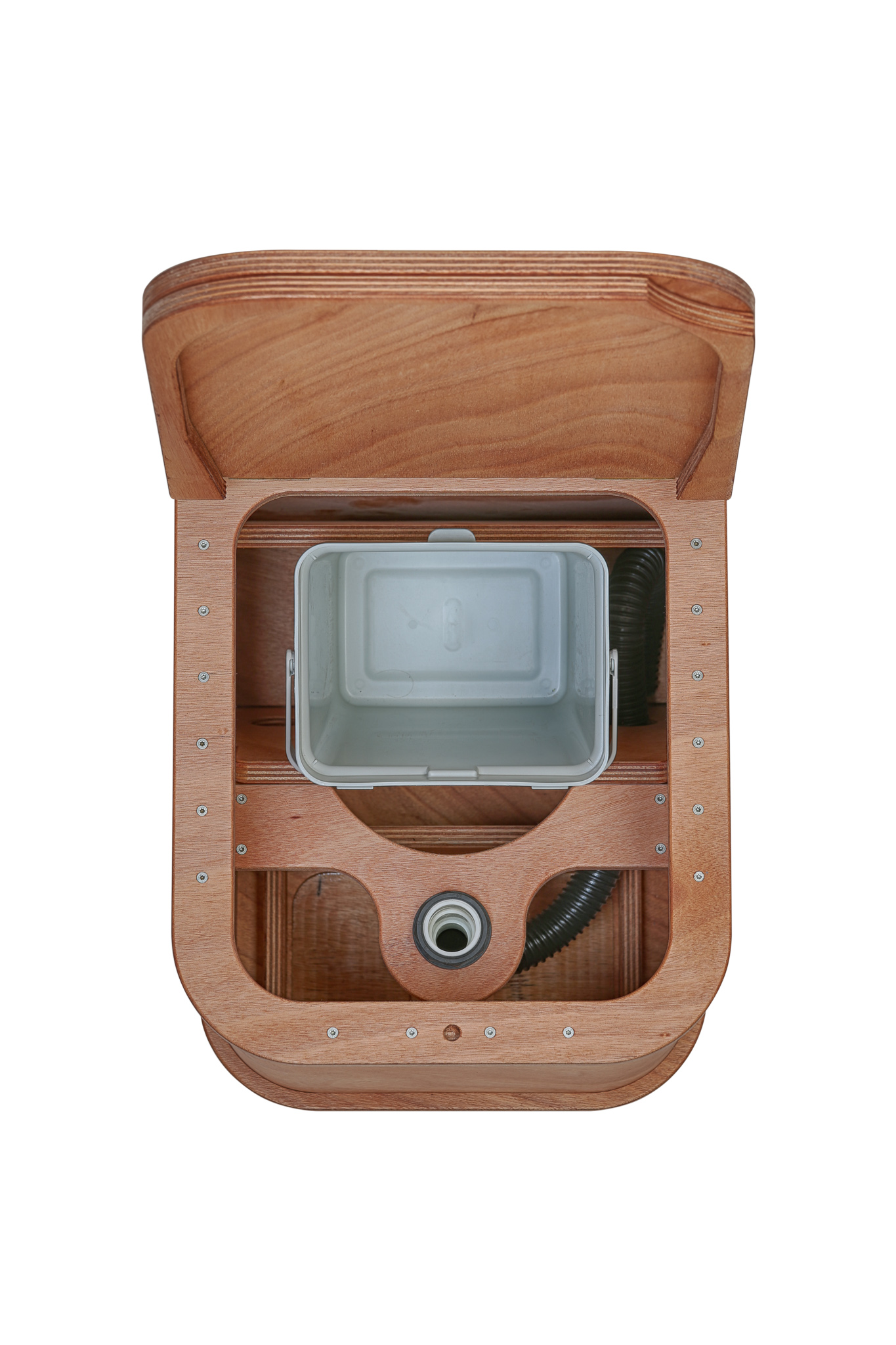 Emmy verfügt über einen internen Urinkanister, kann aber über den mitgelieferten Schlauch an einen externen Kanister oder bei stationärer Verwendung direkt an die Kanalisation angeschlossen werden. Die Feststoffe landen in einem 10 l Eimer und werden am besten mit Einstreu abgedeckt.